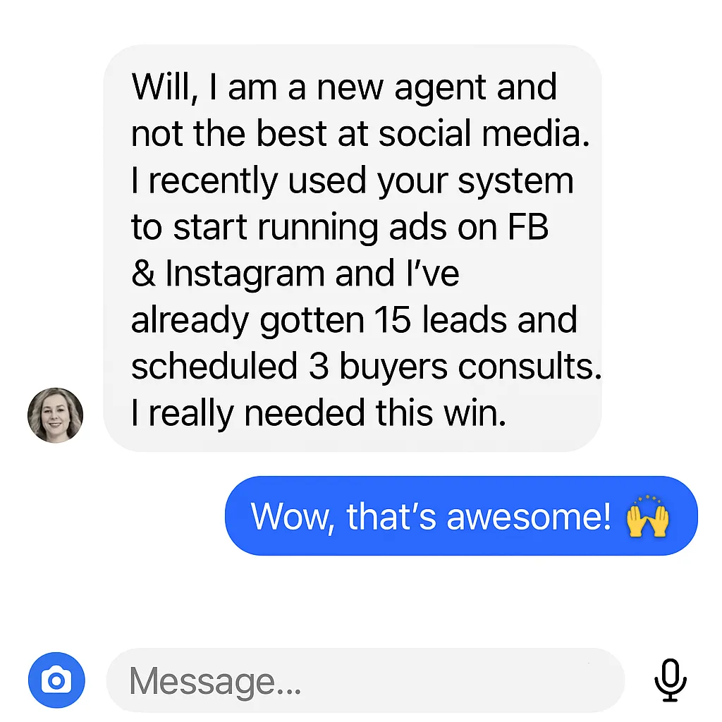Not just for me, but for agents just like you. I’ve had new agents book buyer consults within hours. Some made their first-ever sale using this system. Others are filling their pipeline without cold calling or begging friends for referrals.